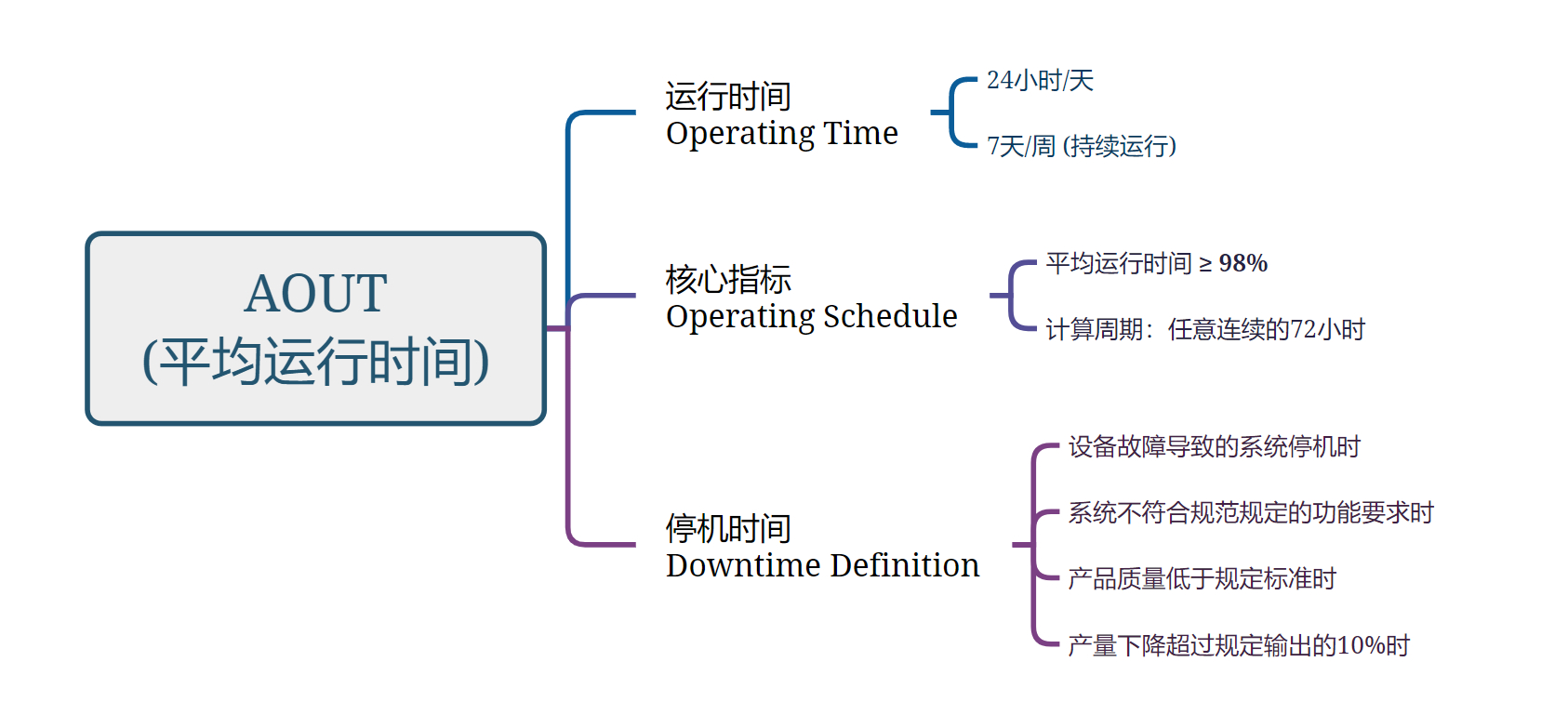 某工业设备的典型可操作性要求:在任何连续72小时的运行期间,系统的平均运行正常时间(AOUT)应为98%(百分比)。